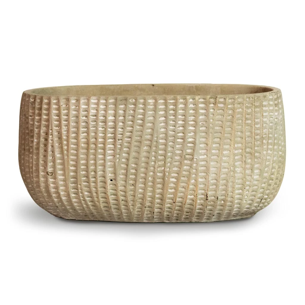 Muted mint textures combine with artisan clay latticework and hints of soft gold threads to give the Feico oval plant bowl a calming natural elegance for displays of wellbeing greenery.