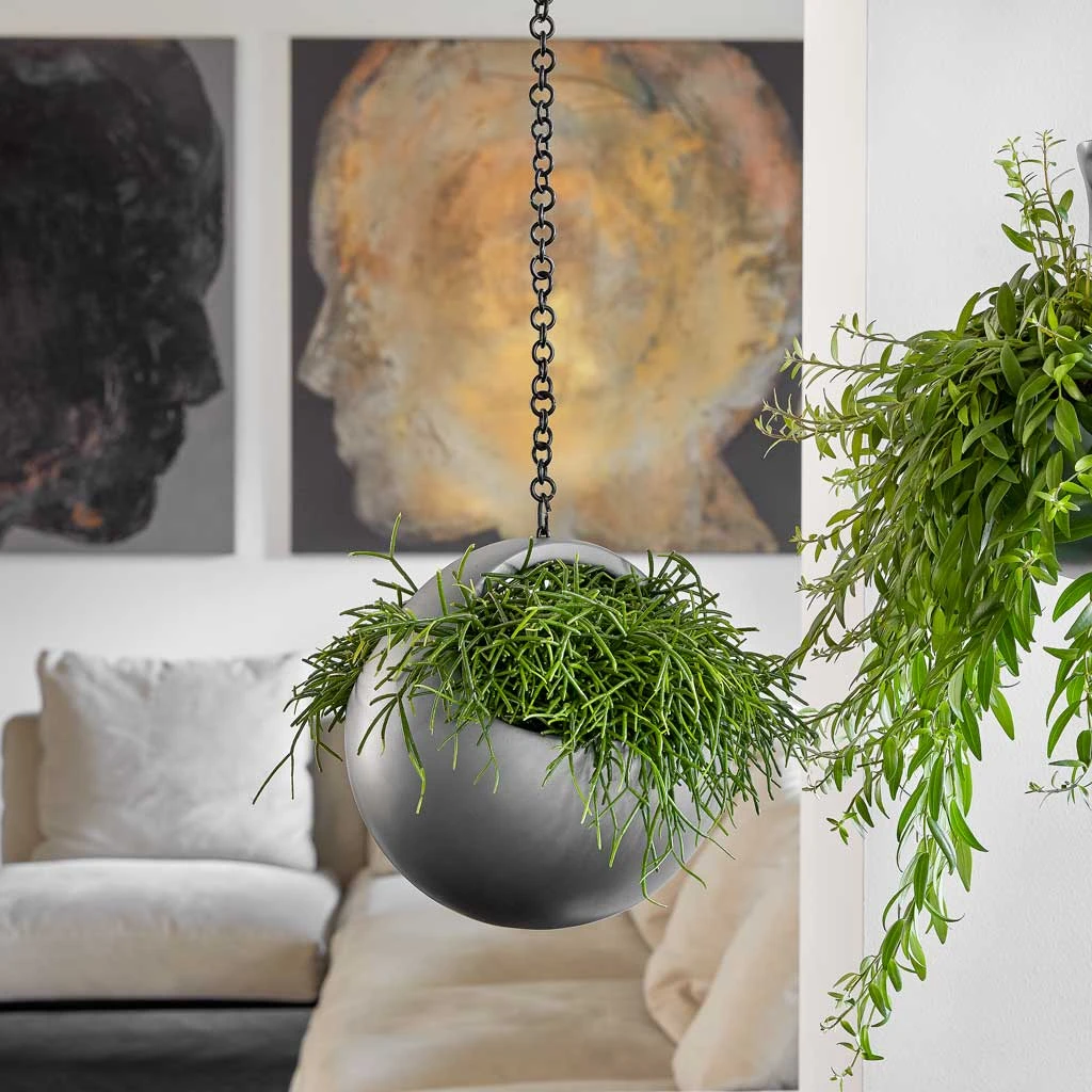 Crafted from polyresin, a durable mixture of ground stone and resin, these planters are built to last. The satin finish is easy to clean and the hanging baskets are supplied with a metal chain for easy installation.