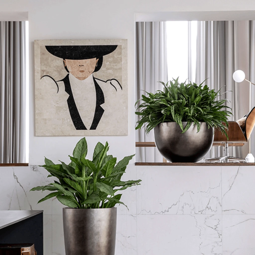 The Metallic plant bowl features a classic rounded design, enveloped in delicate silver leaf and beautifully finished with a muted coffee lacquer.