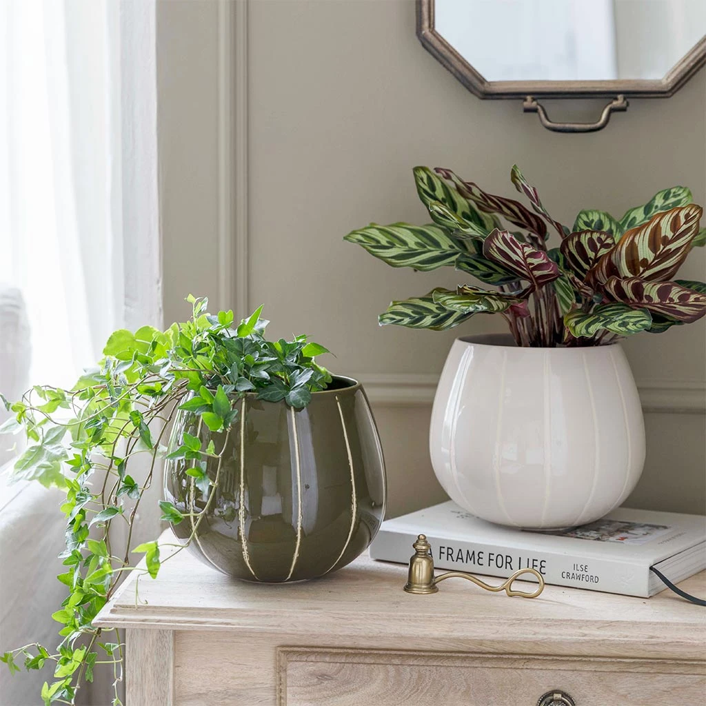 Enhance your space with the elegant Nova Plant Pot, finished in a sophisticated forest green. Delicate white lines embellish the glossy ceramic, hand-applied using the traditional wax relief method. This graceful detailing accentuates its tulip-shaped silhouette, infusing your indoor plant arrangements with a captivating artistic charm.