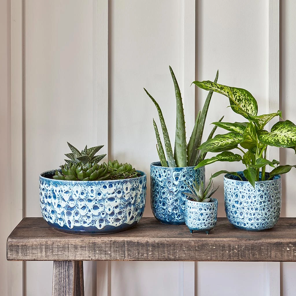 Dive in and bring the serenity of the sea to your plant collection with the aquatic allure of the Ocean Glaze Plant Pot Collection. The collection features plant bowls with a reactive glaze that combines whites into a deep ocean blue awash with sapphire. The bowl-shaped plant pots are finished with a glossy, polished glaze, completing the oceanic appearance.